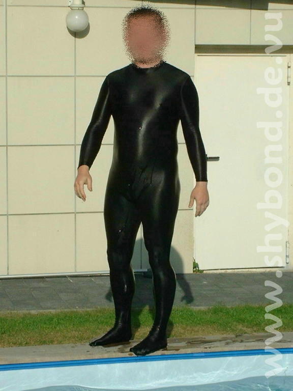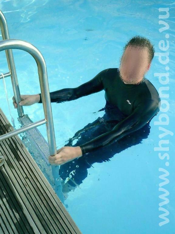 Auch im Wasser halte ich mich mehr aus Spaß denn wegen körperlicher Betätigung auf. Das Glück war mir "hold" und mein neuer Vermieter hat einen Pool im Garten, so daß ich inzwischen verschiedenste Lycra-Klamotten "zu Wasser lassen" konnte und auch ein bischen mit Bondage experimentiert habe. Wenn man im linken Bild mal ganz genau auf die Handgelenke schaut ... es ist nicht ganz so einfach, mit auf dem Rücken gefesselten Händen aus dem Becken zu kommen, aber es geht !