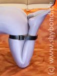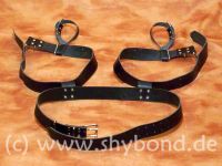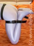 Die Lederriemen, die die Unter-und Oberschenkel zusammenhalten, werden an einem Bauchgurt und (statt der Füße) an Fußriemen befestigt.