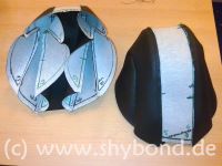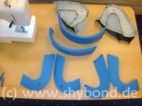 Von den Knien wurde ein Schnittmuster abgenommen und daraus wurden Kniepolster mit Innen- und Außenlage aus Kunstleder genäht, in die Polster aus Iso-Matten-Material gesteckt wurden. Diese Polster können dank Lederriemen variabel an den Beinlingen befestigt werden.