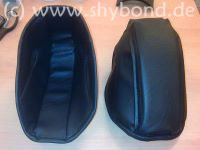 Die Beinlinge sind auch aus Kunstleder genäht und haben an der Außenseite einen Klettverschluß - passend zur Schnalle der Beingurte, an denen sie befestigt sind.