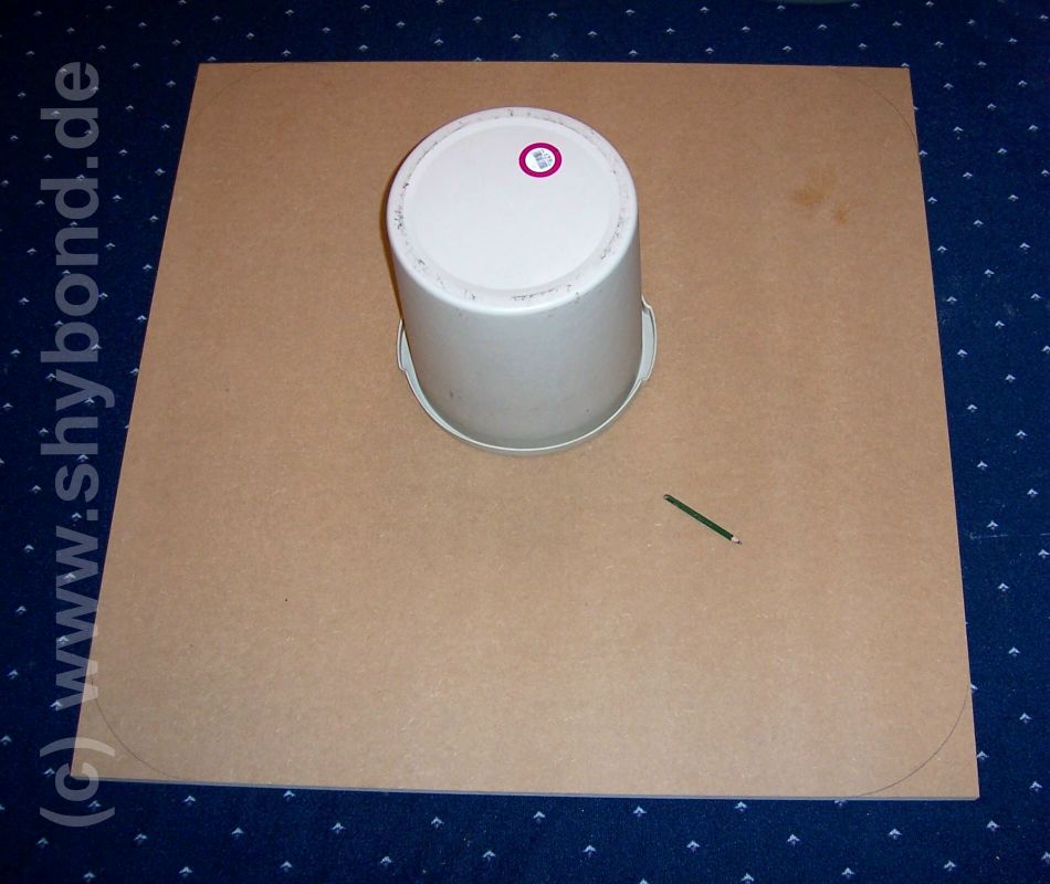 Zuerst werden - zur Vermeidung von spitzen Ecken (aua!!!) und wegen schönerer Optik - die Ecken abgerundet. Als Schablone kann man z.B. ein Mülleimer mißbrauchen und dann werden mittels Stichsäge die Ecken abgeschnitten.