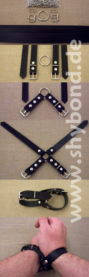 Man nehme zwei Lederriemen (ca.65cm lang) und niete jeweils direkt neben der Schnalle ein Stückchen Leder unter, so das man eine Schlaufe erhält, durch den man den Riemen durchziehen kann - das sieht dann so aus wie im oberen Bild.